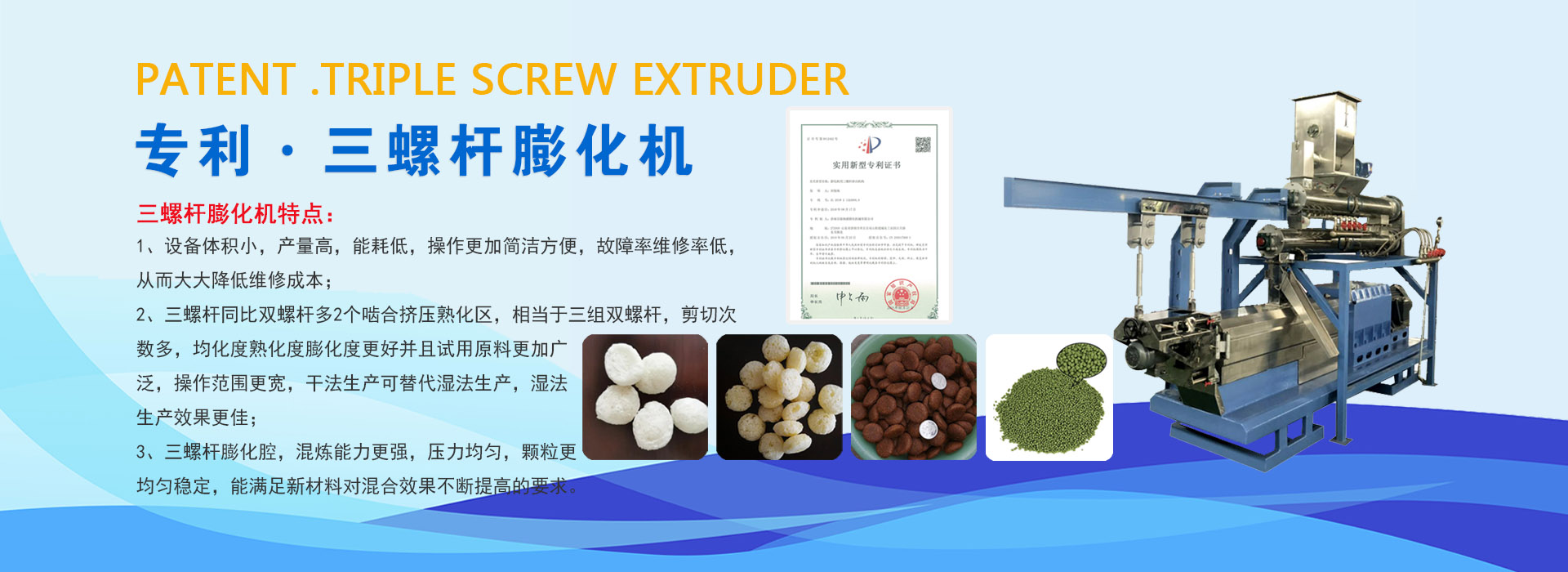 济南百脉海源膨化机械有限公司是集科研开发、制造培训、国际贸易为一体的高新技术企业,并拥有国家专利十余项。十几年来一直致力于挤压膨化工艺及设备的开发和研究,先后研制开发了单螺杆、双螺杆、专利三螺杆生产技术及设备,现已成为国内主要挤压膨化生产设备专业生产厂家。公司立足国内市场,拓展国际市场,产品销往全国各地,并远销到亚洲、欧洲等国家地区,市场占有率逐年增长。公司将继续进取,勇于创新,与国内外同行一起为促进我国膨化机行业发展作出贡献!